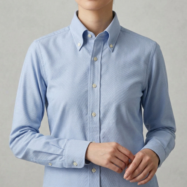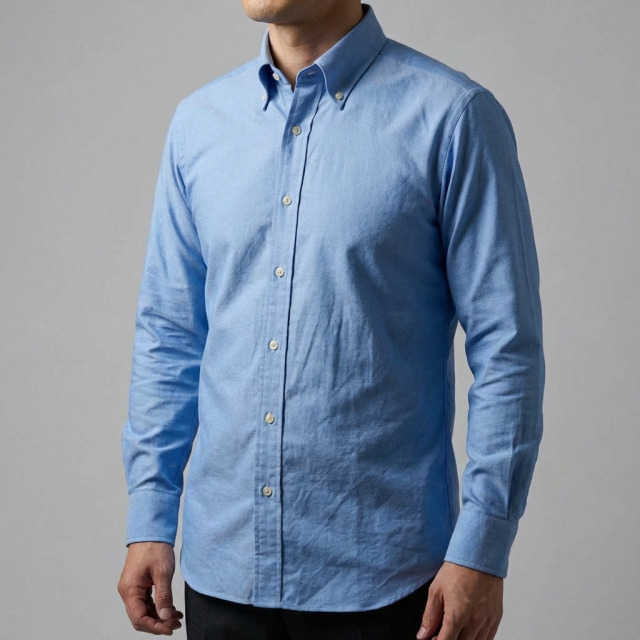 中間くらいのブルー。粗織りのカジュアルなシャツ地。ボタンダウンの代名詞的シャツ生地。ブレザーやジャケットによく合い、ボタンダウンとの相性は最適で、アイビールックなどでは代名詞的な存在。カジュアルシャツ向き。