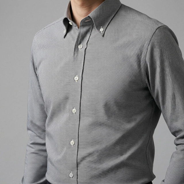 白と黒の織り柄模様。シャツ生地の定番ロイヤルオックス。オックスのドレス版というのは名前だけで、カジュアルでもドレスでも着られる万能シャツ生地。カジュアルシャツ向き。