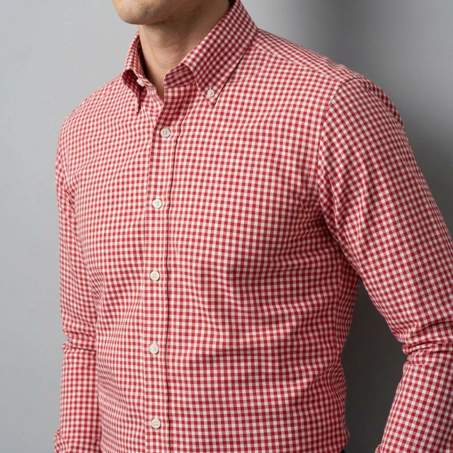 アイビーシャツに多い定番的シャツ地。無地感覚で着られることが多い薄手の平織りシャツ生地。明るいレッド。カジュアルシャツ向き。