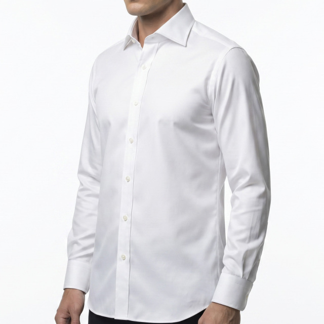 イージーケア(ノンアイロン)の付いた、皺になりにくい張りのあるパリッとした印象の白シャツ生地、ビジネスシャツとしては最適なポプリンブロードです。ブロードとも、ポプリンとも呼ばれるいわゆる、普通の白無地。一枚は持っていたい、シャツの基本です。ドレスシャツ向き。