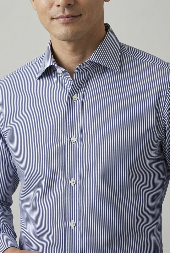 高級120番手のストライプ・ネイビー。シルクのような光沢と肌触り。世界最高品質のストライプです。ドレスシャツ向き。