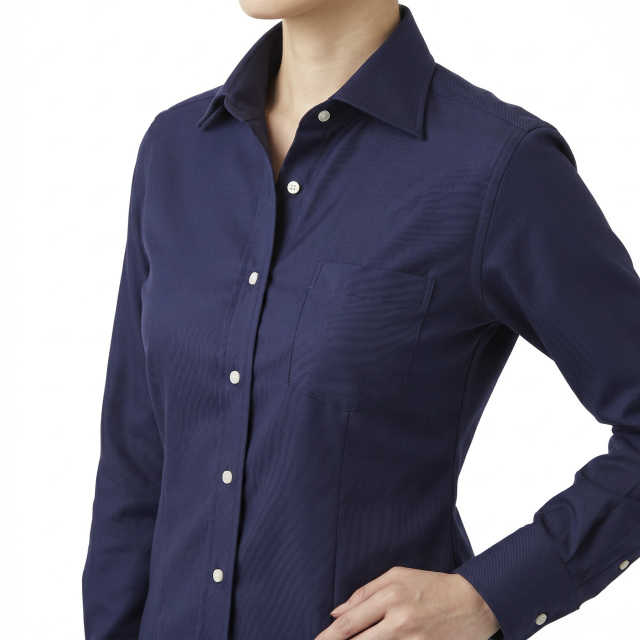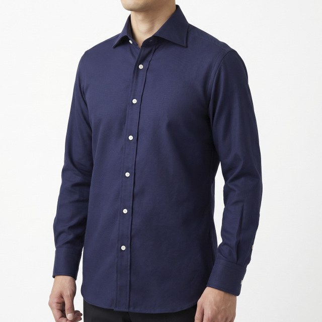 オーソドックスな厚みと柄の大きさのツイル。光沢のあるネイビー。ドレスシャツ向き。