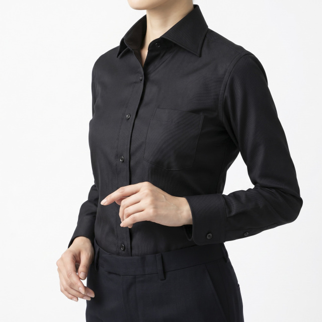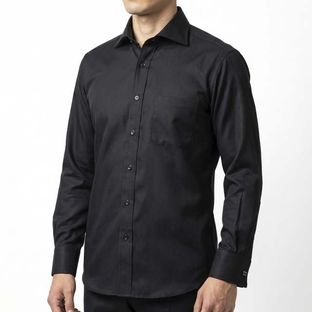オーソドックスな厚みと柄の大きさのツイル。ブラック。ドレスシャツ向き。