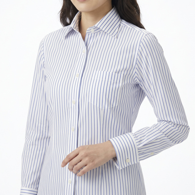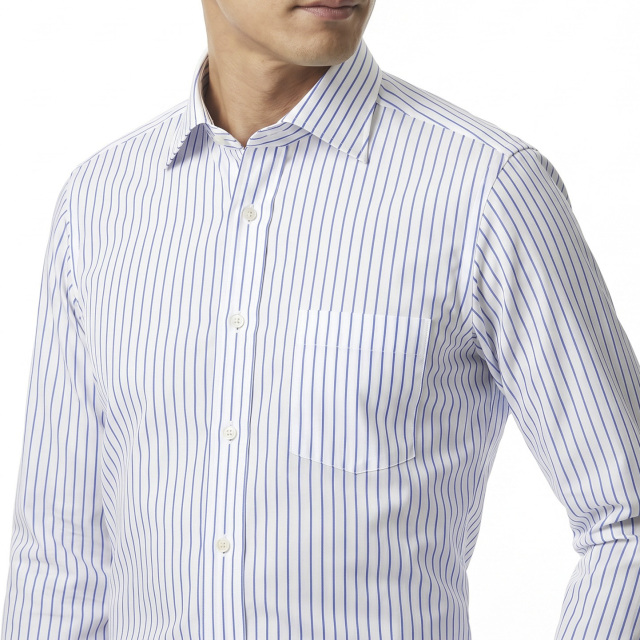 白地に、細め、間隔広めのストライプ。ブルー。ビジネスシャツ向き。