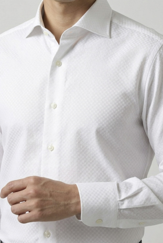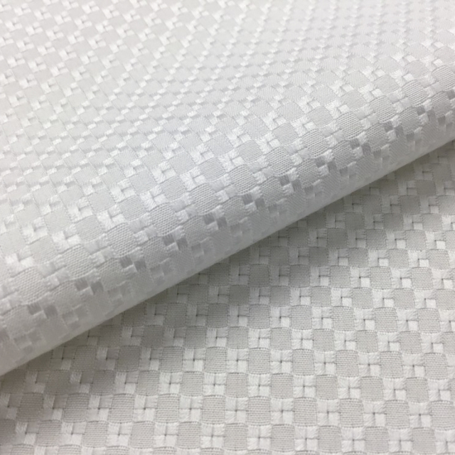 光沢のあるキラキラした四角い格子の織り柄。ドレスシャツ向き。